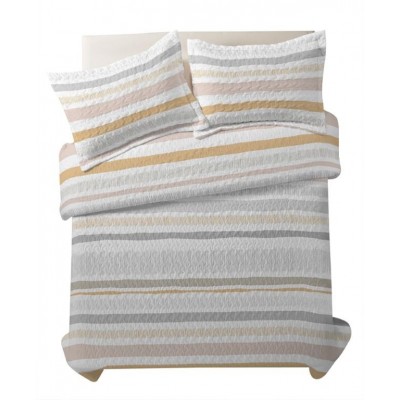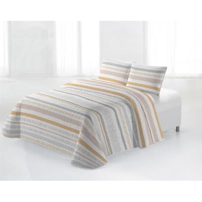 Conjunto de colcha de bouti estampado de rayas y fundas de cojín a juego de 50X70. Guateada con un relleno ligero que le aporta relieve, su tejido esmerilado le aporta un tacto suave y agradable. Este conjunto es ideal como colcha para entretiempo y verano.