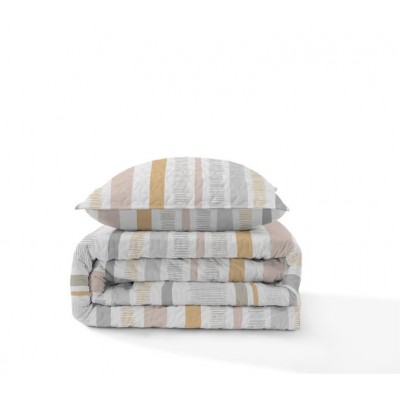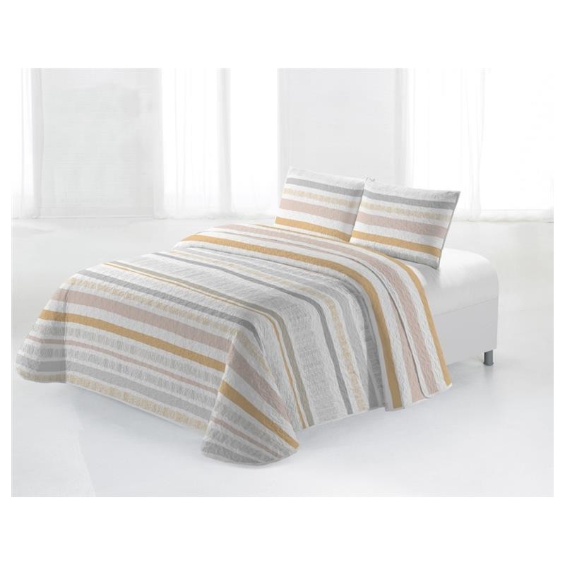 Conjunto de colcha de bouti estampado de rayas y fundas de cojín a juego de 50X70. Guateada con un relleno ligero que le aporta relieve, su tejido esmerilado le aporta un tacto suave y agradable. Este conjunto es ideal como colcha para entretiempo y verano.