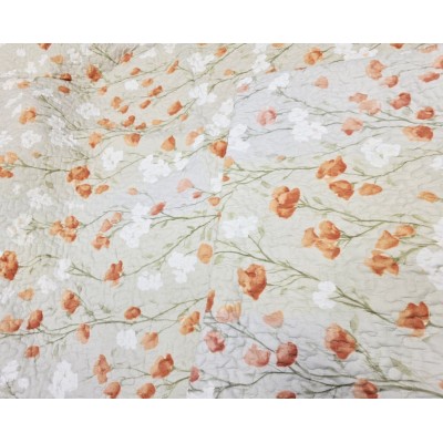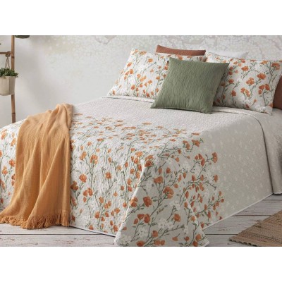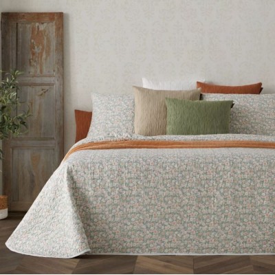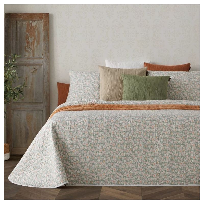 Conjunto de colcha de bouti estampado de flores y hojas a los pies de la cama y fundas de cojín a juego de 50X70. Guateada con un relleno ligero que le aporta relieve, su tejido esmerilado le aporta un tacto suave y agradable. Este conjunto es ideal como colcha para entretiempo y verano.