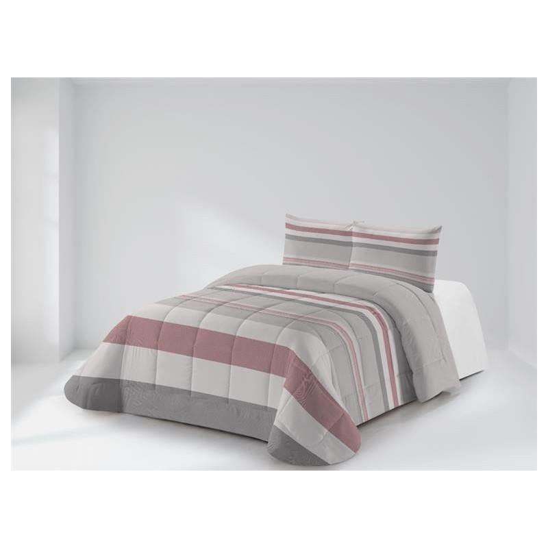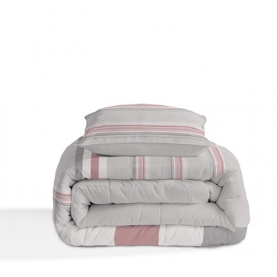 Conjunto de edredón con estampado de rayas y fundas de cojín a juego de 50X70. Guateado a rombos, con un relleno extra suave que le aporta relieve y un tacto muy agradable. Este conjunto es ideal para las frías noches de otoño e invierno.