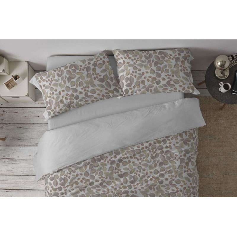 Juego de funda nórdica, en tono marrón verdoso sobre fondo crudo, evoca un estampado natural de hojas.