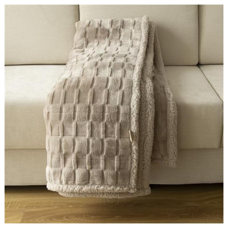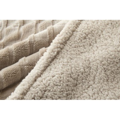 Manta jacquard gruesa y con textura súper suave, dibujo geométrico y reverso de borreguillo. Ideal para cualquier estancia del hogar, con una medida ideal para cubrirte entero en el sofá